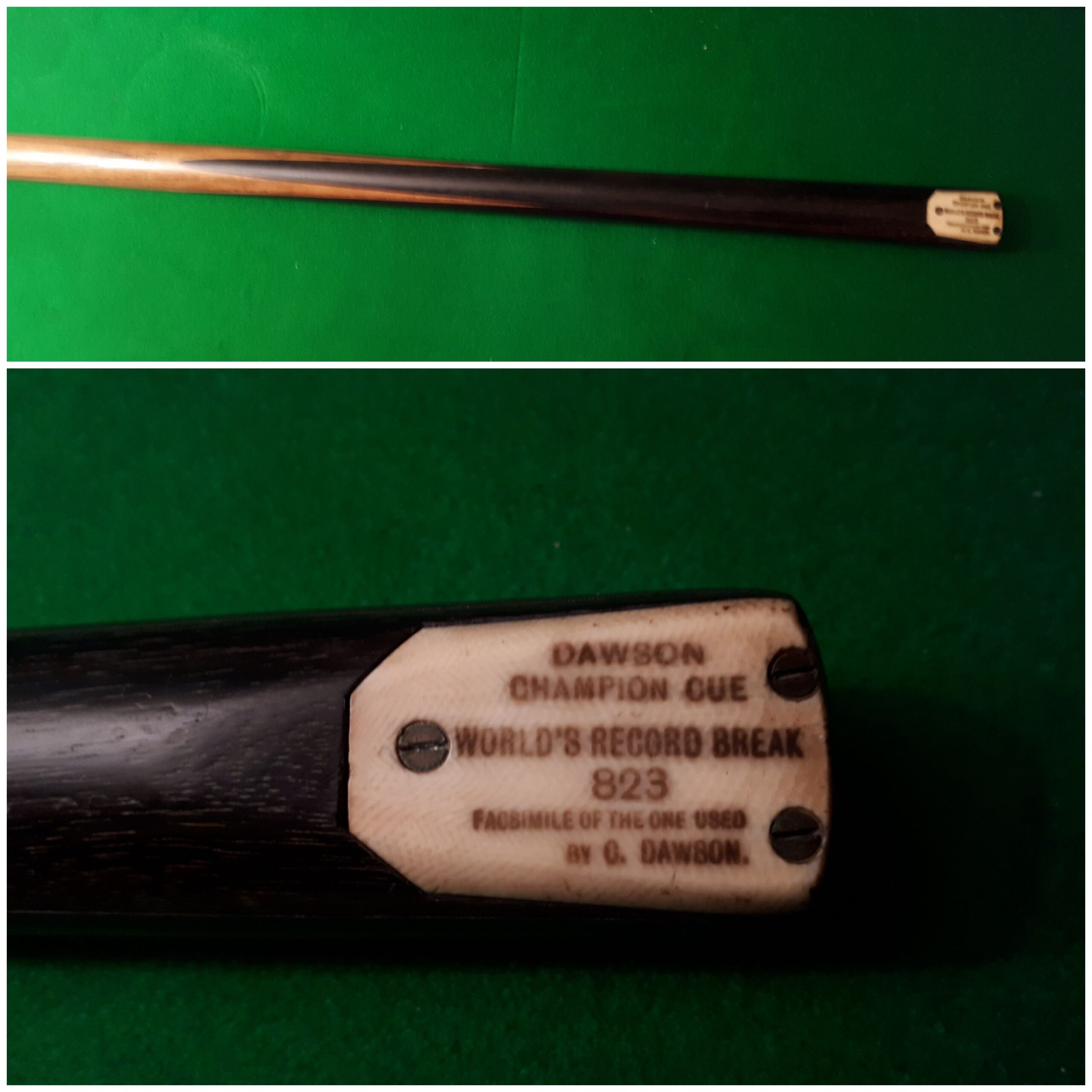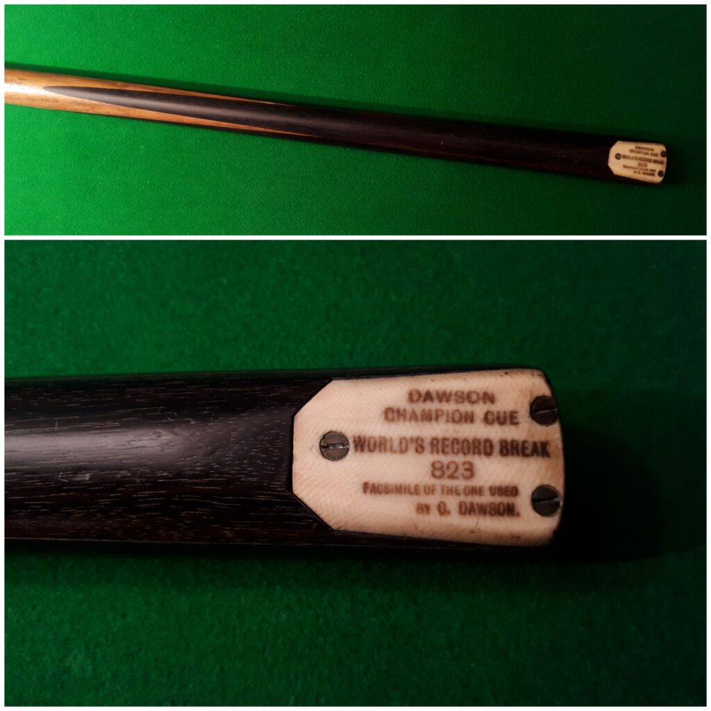 The Charles Dawson Champion cue commemorates the world record 823 break made by Dawson.